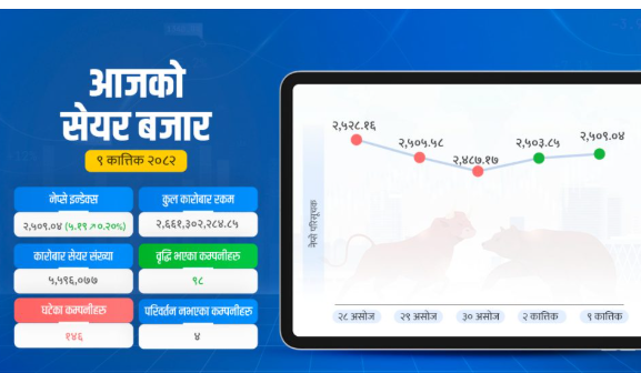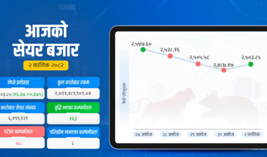 Facebook X Email Telegram २७ कात्तिक, काठमाडौं । साताको अन्तिम कारोबार दिन सेयर बजार १‍.१३ अंक बढेको छ । सो वृद्धिपछि नेप्से परिसूचक २५४५ अंकमा कायम भएको छ । १२ : ३१ बजे नेप्से २५३० अंकसम्म झरेको थियो । जुन…