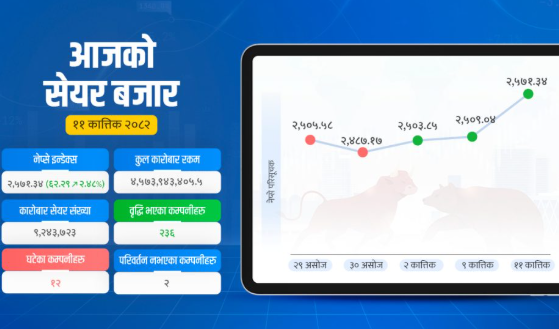 Facebook X Email Telegram २५ कात्तिक, काठमाडौं । अघिल्ला तीन कारोबार दिन लगातार झरेको सेयर बजार मंगलबार बढेको छ । अघिल्लो दिनको तुलनामा आज नेप्से परिसूचक ३.२१ अंक बढेको हो । सो वृद्धिपछि २५६५ अंकमा नेप्से अडिएको छ । आज…